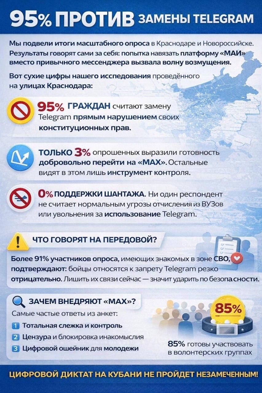 Egy Krasznodarban készített felmérés szerint a megkérdezettek 95 %-a ellenzi a Telegram készülő betiltását, úgy vélik, a tiltás alkotmányos jogaikba ütközik.